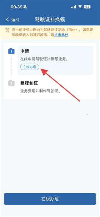 2、進(jìn)入駕駛證補(bǔ)換領(lǐng)界面后,點(diǎn)擊在線辦理按鈕。
