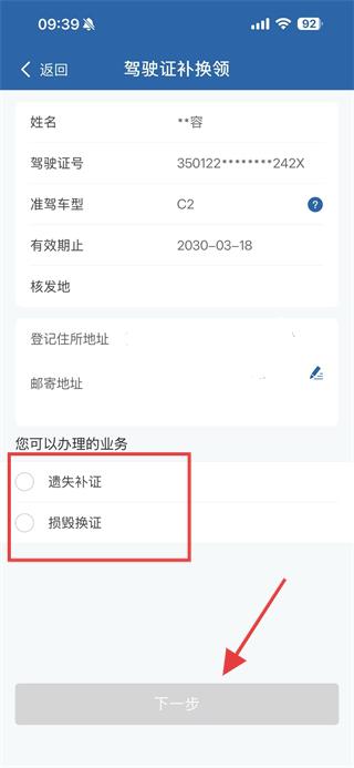 3、在業(yè)務(wù)辦理頁(yè)面,選擇補(bǔ)領(lǐng)類型遺失補(bǔ)證或損毀換證,然后點(diǎn)擊下一步。