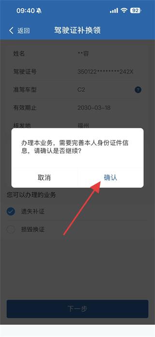 4、在彈出的提示框中點(diǎn)擊確認(rèn),完善本人身份證件信息后,按流程提交申請(qǐng)即可補(bǔ)領(lǐng)駕駛證。