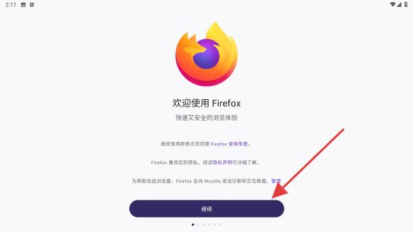 1、歡迎頁(yè):安裝完成后自動(dòng)彈出歡迎使用Firefox界面,點(diǎn)擊繼續(xù)的按鈕進(jìn)行下一步。
