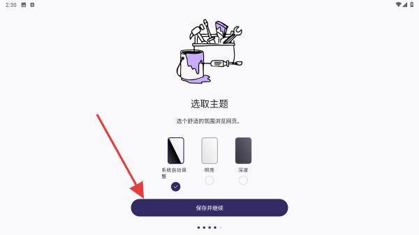 3、主題選擇:進(jìn)入選取主題頁(yè),系統(tǒng)自動(dòng)/明亮/深邃,選好后點(diǎn)擊保存并繼續(xù),完成初始化并進(jìn)入主界面。