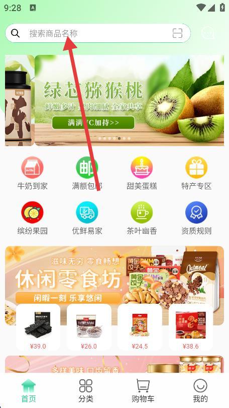 1、打開(kāi)優(yōu)佳悅享App,點(diǎn)擊首頁(yè)上方的搜索商品名稱搜索欄。