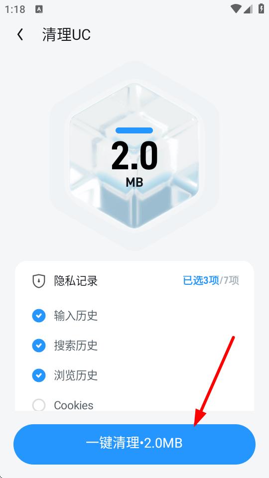 4、在清理UC頁面,選擇需要清除的記錄類別,如輸入歷史、搜索歷史、瀏覽歷史等,然后點擊一鍵清理按鈕,即可清除所選緩。