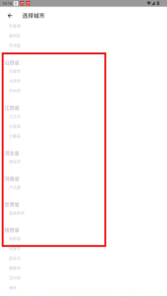 3、在城市選擇頁面,能看到省份及下屬城市列表,可從中選擇想要切換的城市。