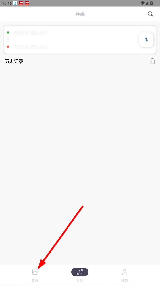1、進(jìn)入app后,點擊底部首頁,可進(jìn)入導(dǎo)乘頁面,還能查看歷史記錄。