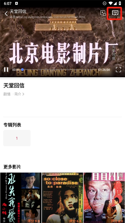 4、進入后將會自動進行影視作品的播放,手機投屏功能在進入播放頁面的右上角點擊即可進行投屏。