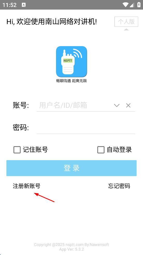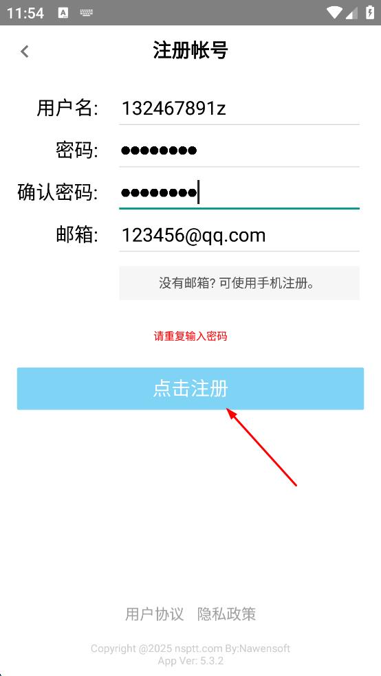 4、確認(rèn)用戶名、密碼、確認(rèn)密碼和郵箱輸入無誤后,點擊點擊注冊按鈕,即可完成南山網(wǎng)絡(luò)對講機(jī)APP的注冊操作。