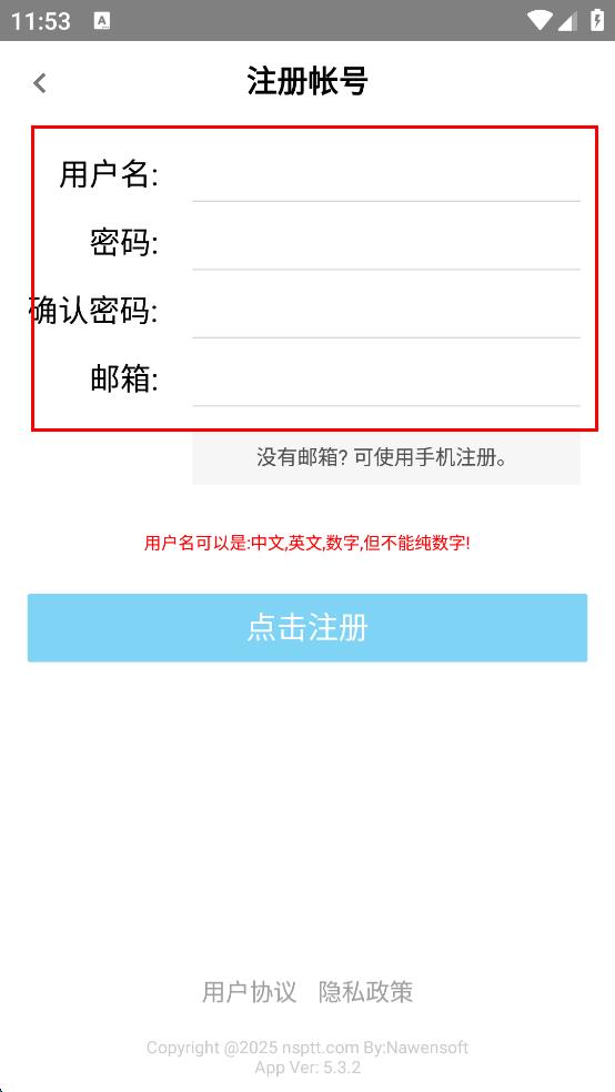 3、在注冊帳號頁面,依次輸入用戶名、密碼、確認(rèn)密碼以及郵箱,確保輸入的信息符合要求,用戶名不能純數(shù)字。