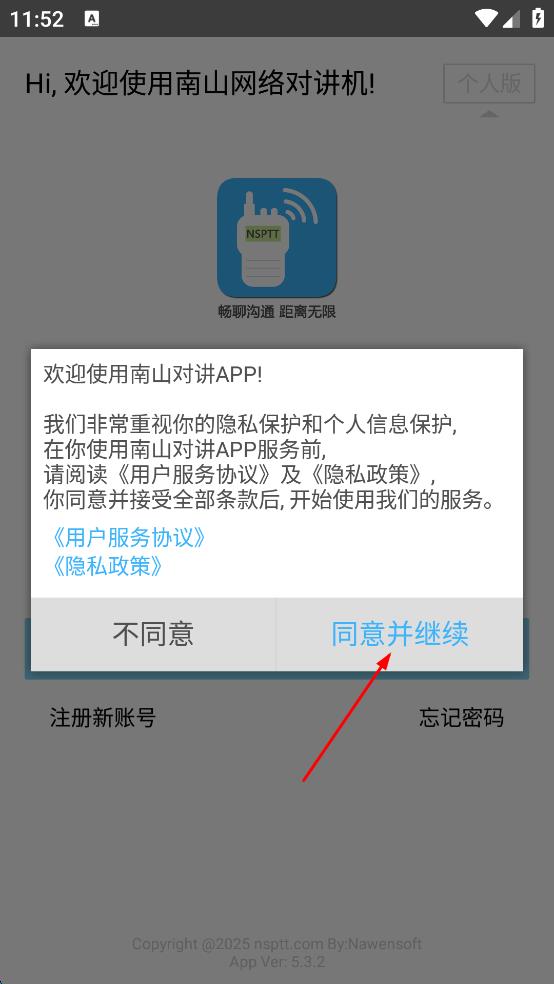 1、打開南山網(wǎng)絡(luò)對講機(jī)APP,會彈出關(guān)于用戶服務(wù)協(xié)議及隱私政策提示,仔細(xì)閱讀后,點擊同意并繼續(xù),進(jìn)入到登錄頁面。
