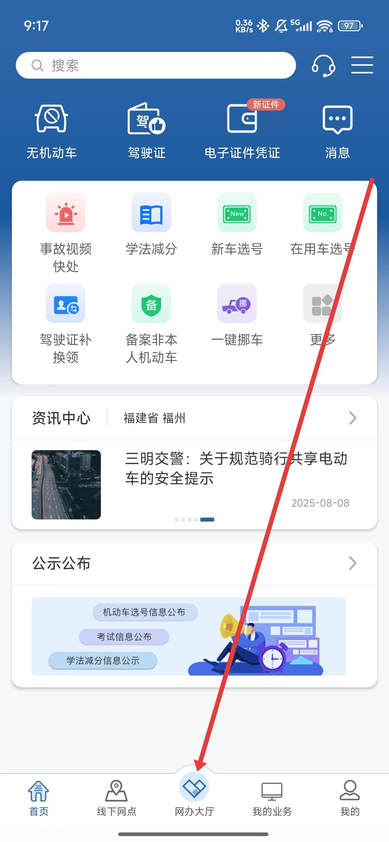 1、在進入到交管12123首頁中,可以點擊底部的網(wǎng)辦大廳進入查看更多服務(wù)。