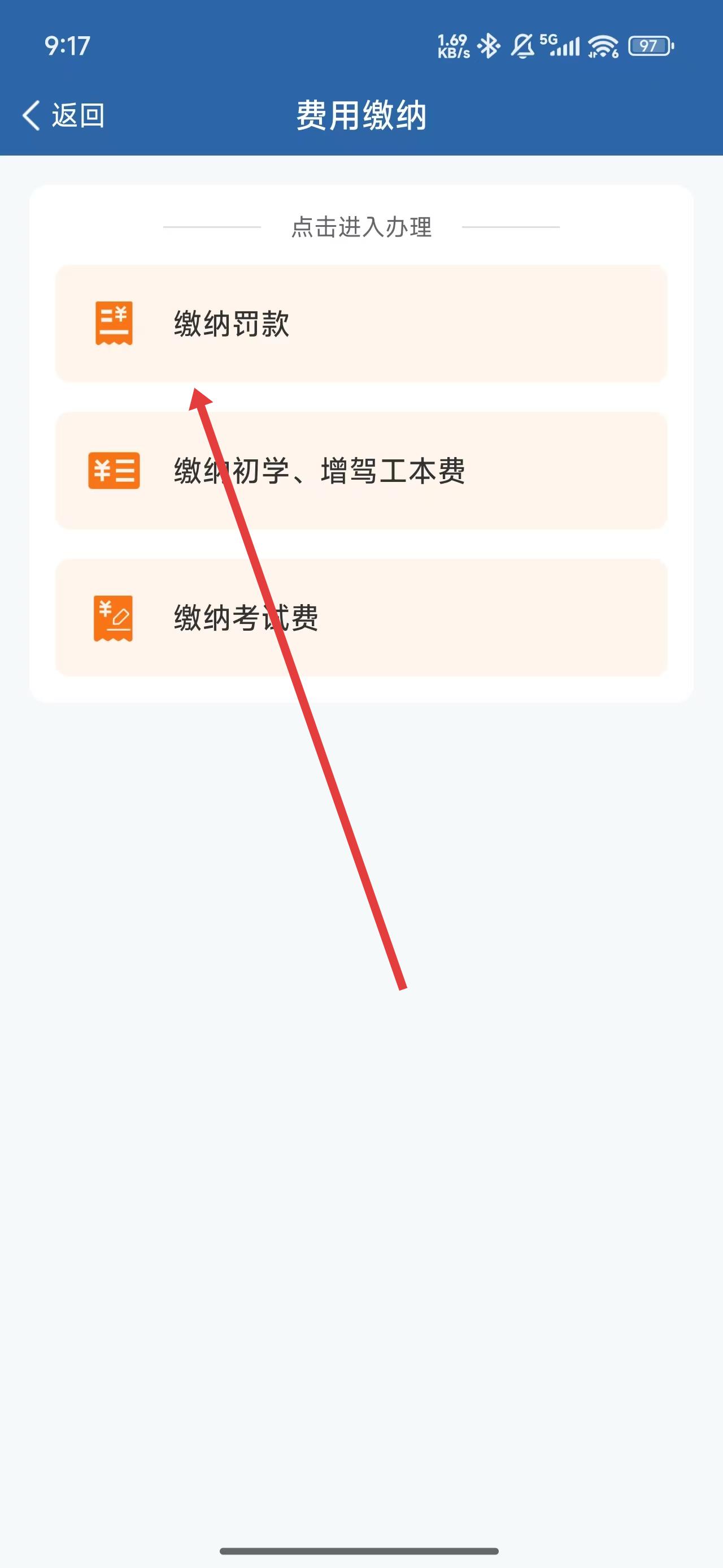 3、在跳轉(zhuǎn)到費用繳納頁面后,選擇要繳費的業(yè)務(wù),點擊繳納罰款即可進入繳納。