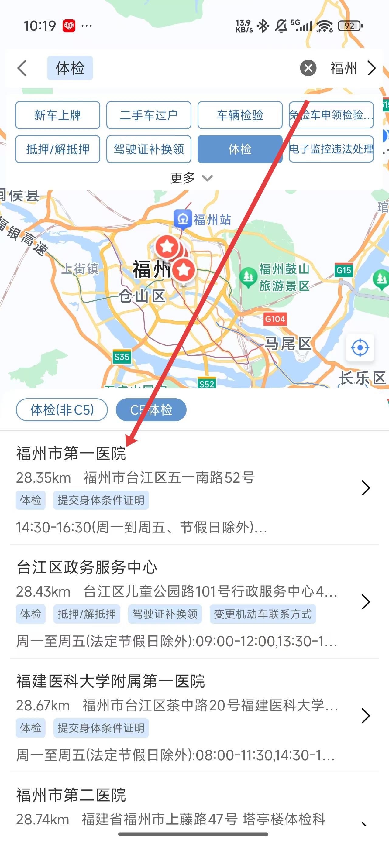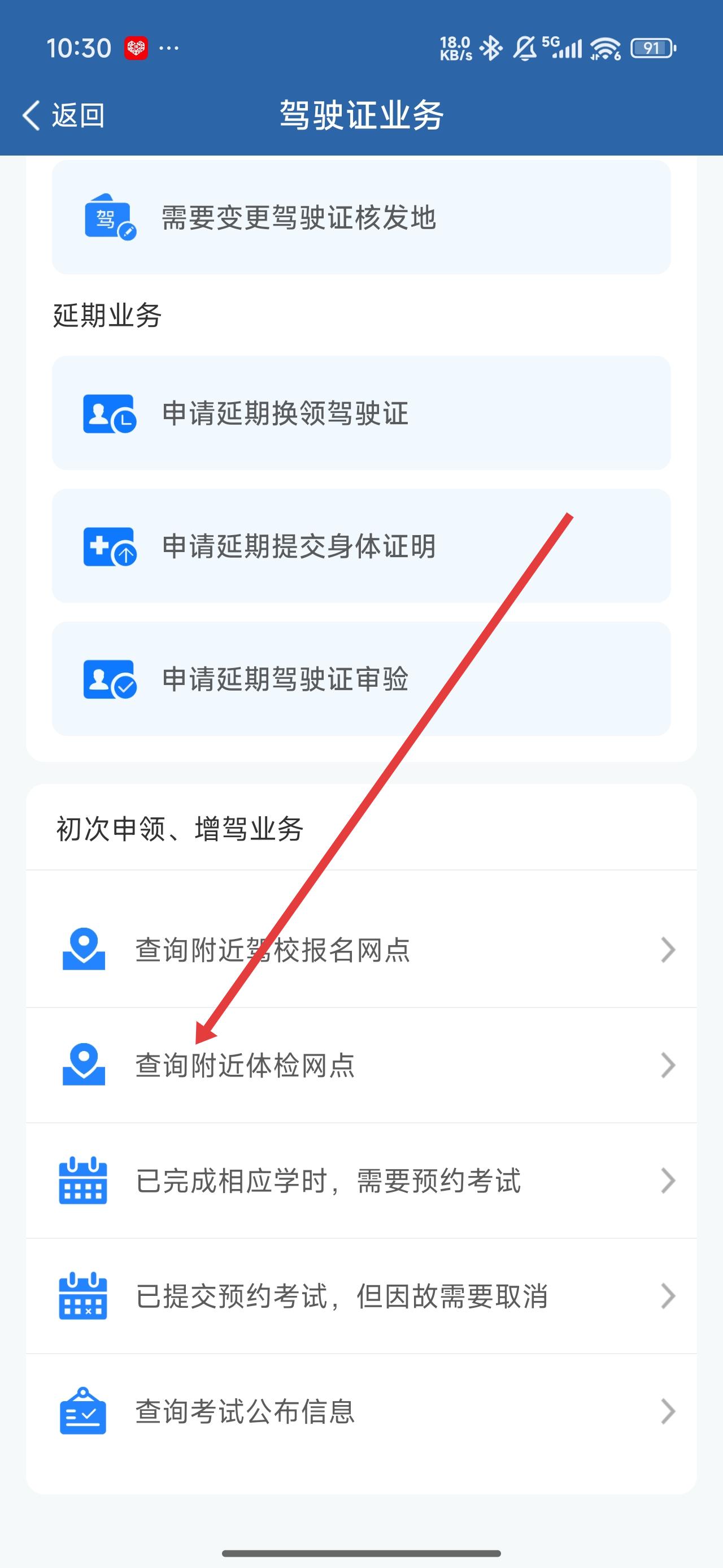 2、在跳轉(zhuǎn)到駕駛證業(yè)務(wù)頁面中,可以點(diǎn)擊查詢附近體檢網(wǎng)點(diǎn)選項(xiàng),查看附近的體檢中心。