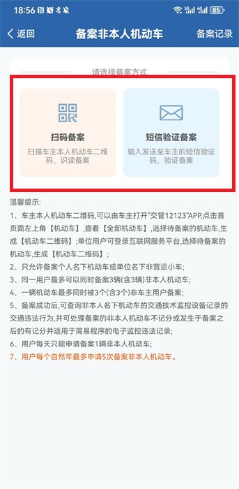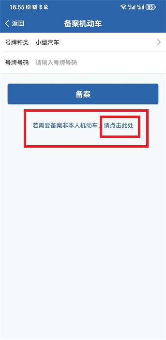 3、然后在備案的界面之中,點(diǎn)擊其中的【若需要備案非本人機(jī)動(dòng)車,請點(diǎn)擊此處】去進(jìn)行備案;