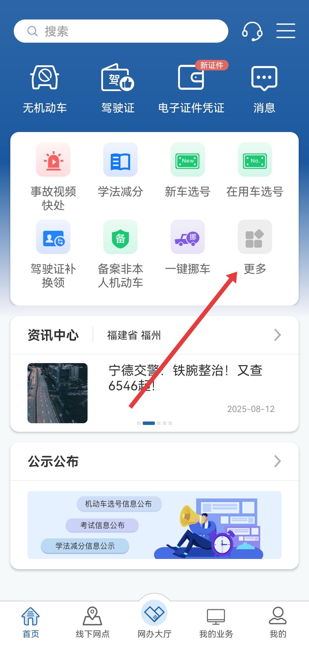 1、打開交管12123APP首頁,需要點(diǎn)擊主頁功能區(qū)的更多選項(xiàng),然后進(jìn)入業(yè)務(wù)中心的頁面。