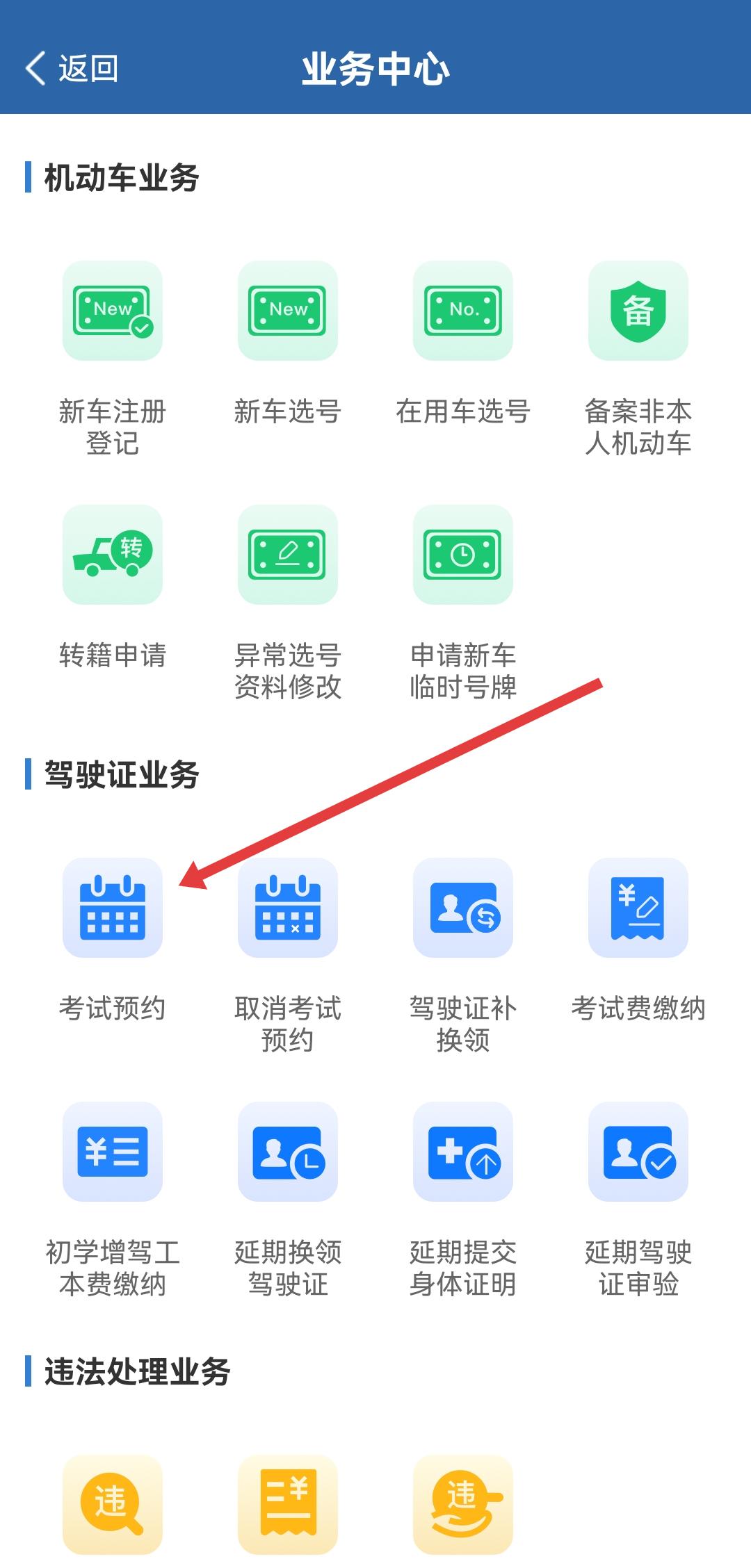 2、在交管12123業(yè)務(wù)中心的駕駛證業(yè)務(wù)模塊中,點(diǎn)擊考試預(yù)約的選項(xiàng),進(jìn)入考試預(yù)約的界面。