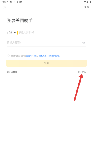 1、在美團(tuán)騎手密碼登錄界面,點(diǎn)擊右側(cè)忘記密碼選項(xiàng),進(jìn)入密碼找回流程,開啟賬號密碼重置的第一步操作。