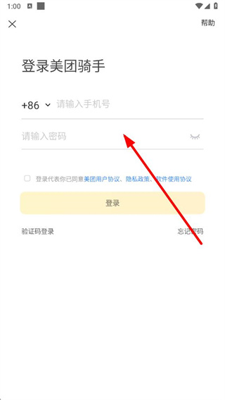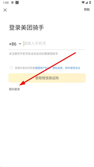 1、在登錄美團(tuán)騎手界面,點(diǎn)擊密碼登錄選項(xiàng),切換到密碼登錄模式。