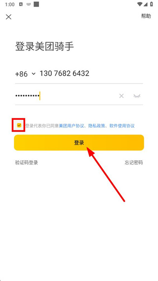 3、勾選同意美團(tuán)用戶協(xié)議、隱私政策、軟件使用協(xié)議,然后點(diǎn)擊登錄按鈕完成操作。