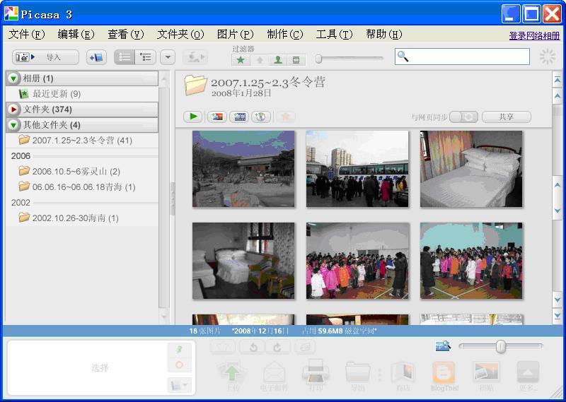 Picasa每次啟動(dòng)時(shí),會(huì)自動(dòng)掃描指定文件夾,啟動(dòng)后界面如下: