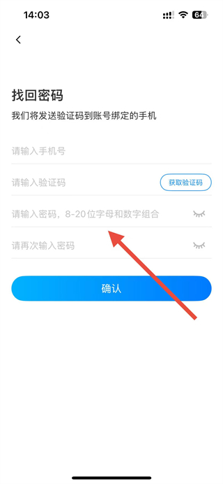 4、在找回密碼頁(yè)面,依次輸入手機(jī)號(hào)、獲取并輸入驗(yàn)證碼,設(shè)置新密碼,點(diǎn)擊確認(rèn)完成密碼找回。