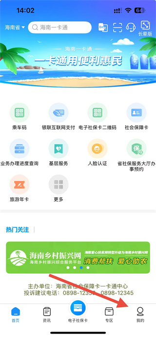 1、打開(kāi)海南一卡通app,點(diǎn)擊底部導(dǎo)航欄的我的選項(xiàng)進(jìn)入個(gè)人頁(yè)面。