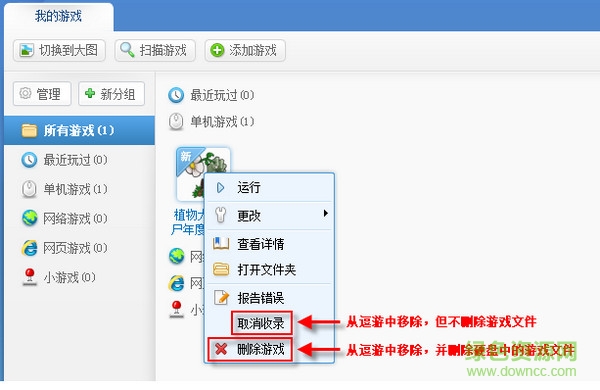 如果您想徹底刪除游戲,請在【我的游戲】中右鍵點擊圖標在菜單中選擇【刪除游戲】,如果您只是想從逗游【我的游戲】中移除該游戲請選擇【取消收錄】。