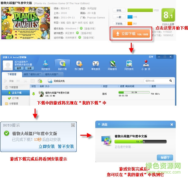 在逗游網(wǎng)中,單機游戲和網(wǎng)絡(luò)游戲是需要下載并安裝后才能玩的,下圖將為您演示下載及安裝過程。
