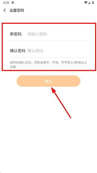 4、在設(shè)置密碼頁面,按要求輸入新密碼和確認(rèn)密碼,點(diǎn)擊確認(rèn)按鈕完成密碼設(shè)置。
