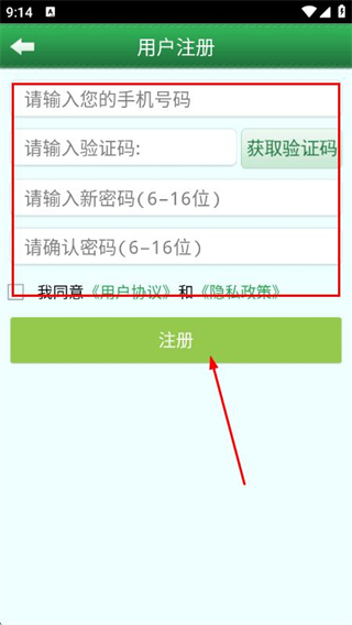 3、輸入手機(jī)號(hào)碼、驗(yàn)證碼、新密碼并確認(rèn)密碼,勾選協(xié)議,點(diǎn)擊注冊(cè)。