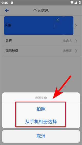 4、在選項(xiàng)框中,選擇拍照或從手機(jī)相冊選擇,即可完成頭像更換。