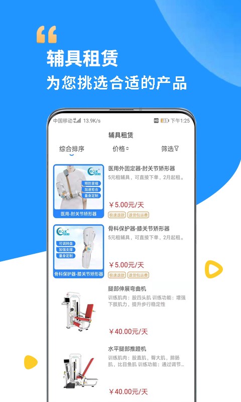 進入輔具租賃版塊,對各個輔具假肢進行篩選排序,選擇符合需求的進入查看