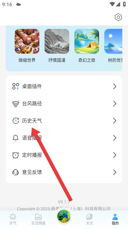 1、打開最美天氣APP,進(jìn)入我的頁(yè)面,點(diǎn)擊歷史天氣的選項(xiàng),進(jìn)入歷史天氣查詢的界面。