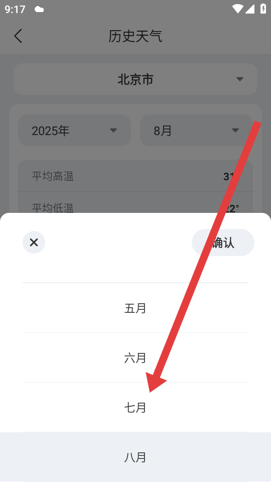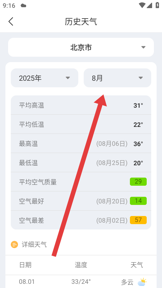 2、在歷史天氣的頁(yè)面,可以通過頂部下拉框選擇城市、年份、月份,精準(zhǔn)定位要查詢的時(shí)段。