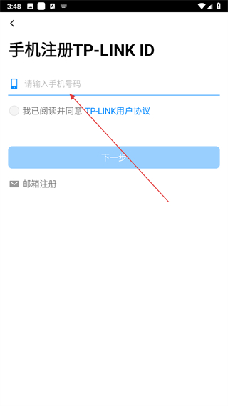 3、跳轉(zhuǎn)到手機(jī)注冊TP-LINK ID界面,輸入你的手機(jī)號碼,并勾選協(xié)議點(diǎn)擊下一步。