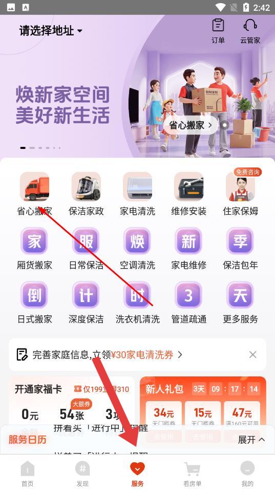 1、打開自如App,在服務頁面中,找到并點擊省心搬家選項。