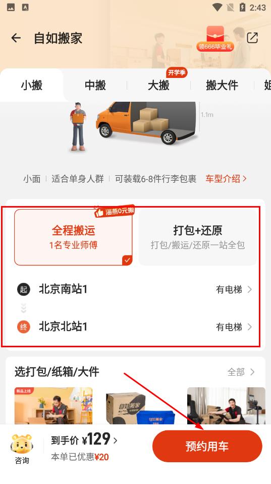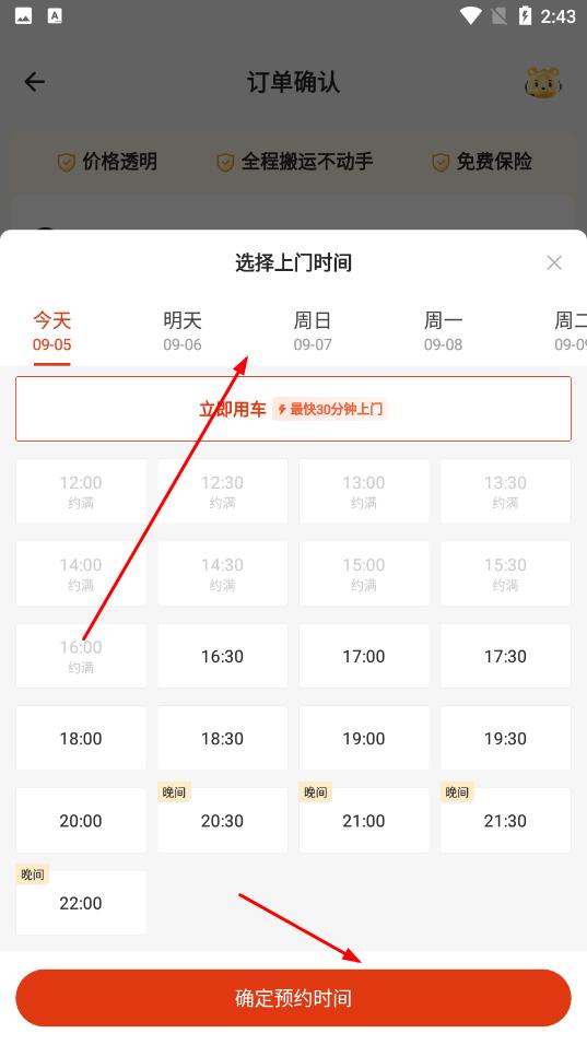4、在訂單確認頁面,選擇上門時間,點擊確定預約時間,完成搬家預約。