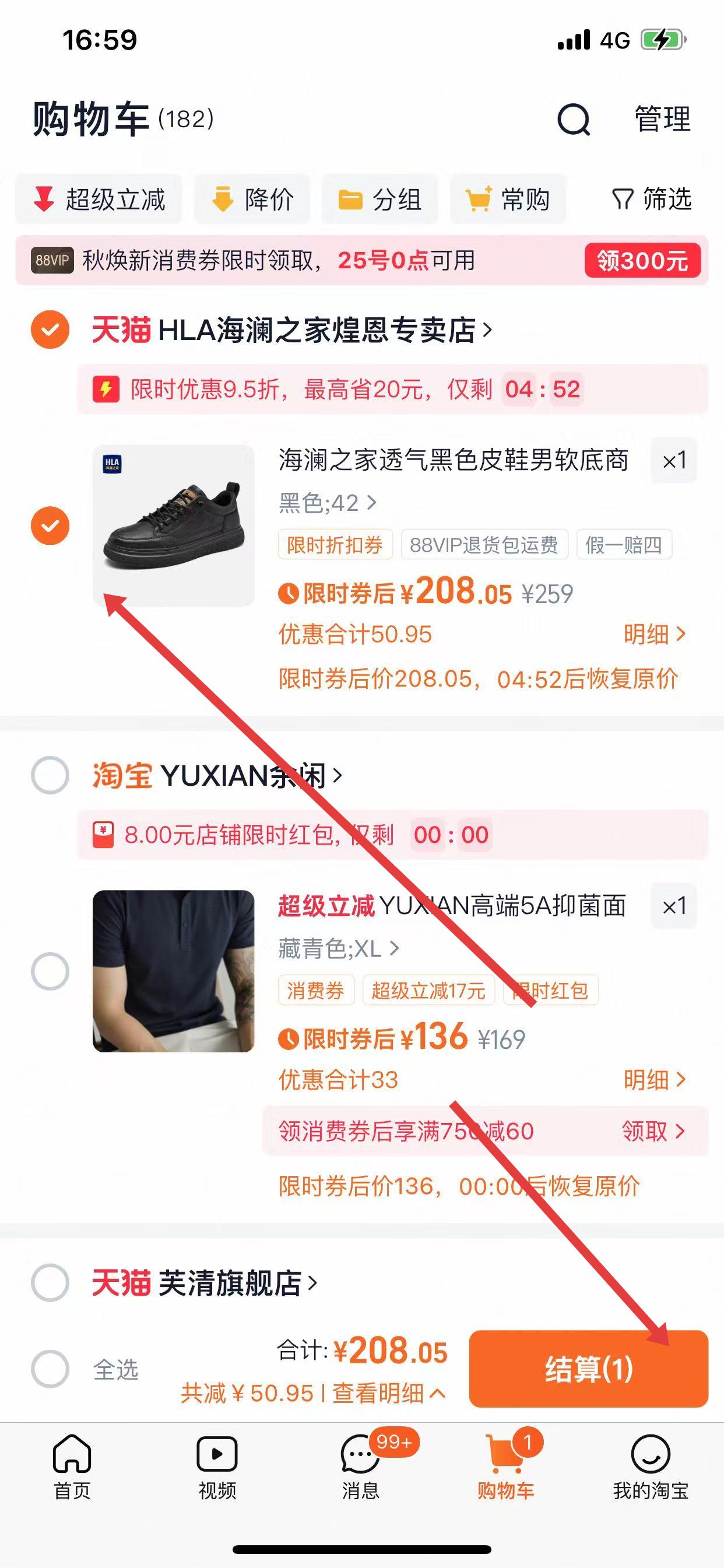 1.、打開淘寶APP,進入「購物車」,勾選要送朋友的商品,點擊右下角「結(jié)算」,進入訂單頁。