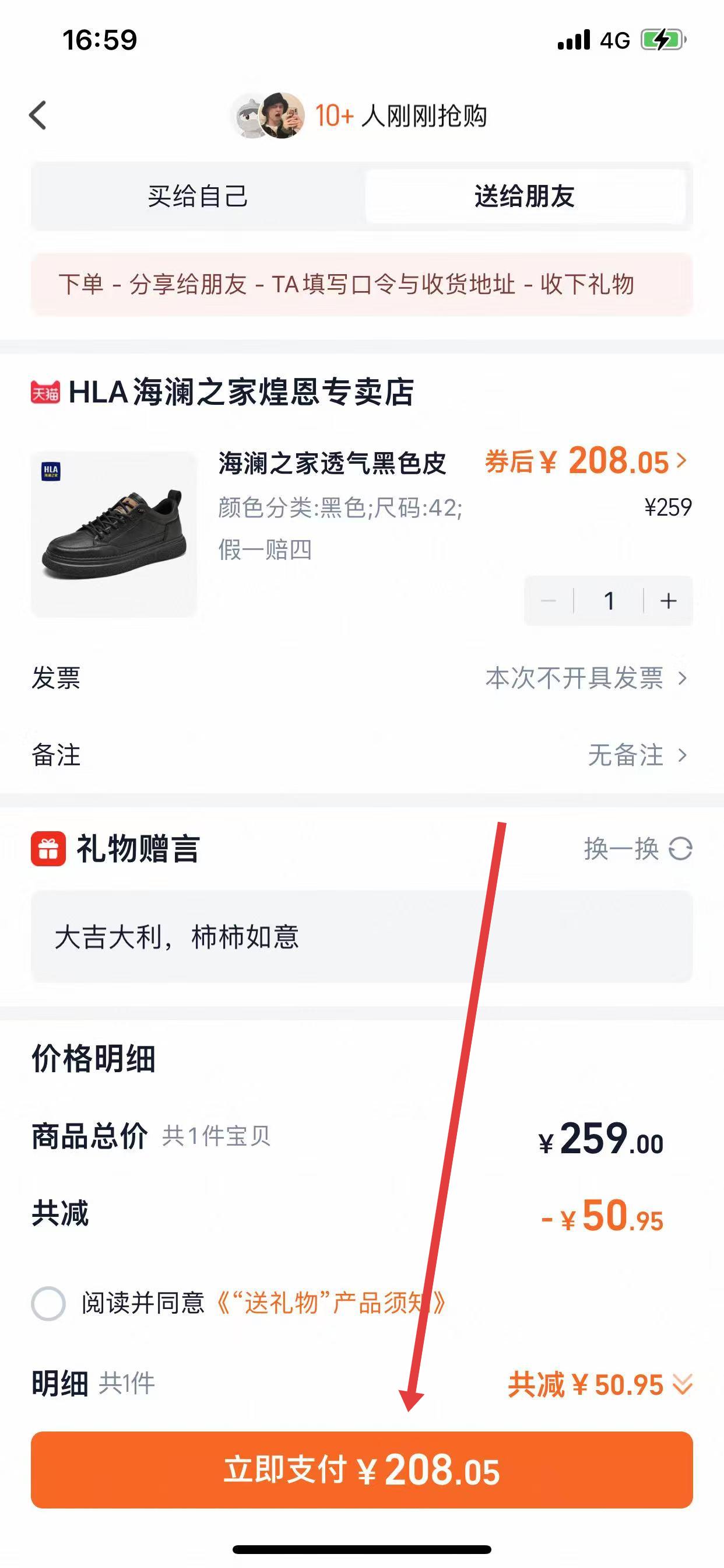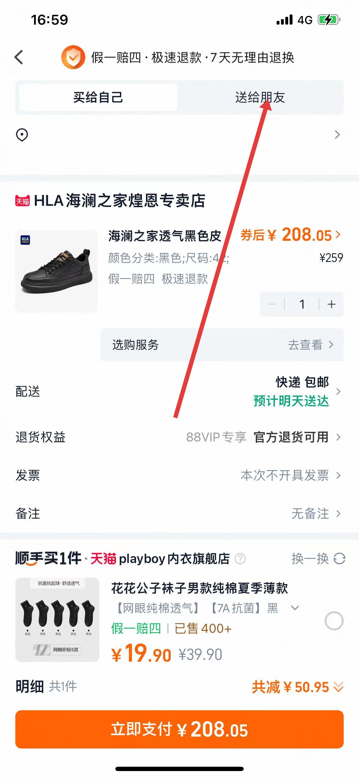 2、在訂單確認頁,點擊頂部「送給朋友」選項,切換成為送禮模式。