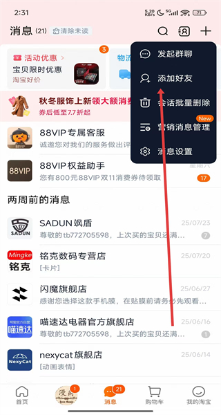 2、在點擊加號按鈕展開的功能選項中,點擊添加好友選項進行操作。