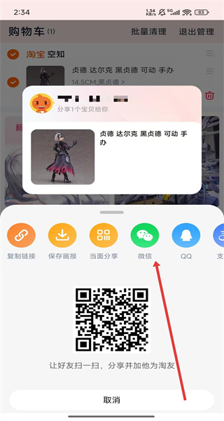 4、在分享彈窗出現(xiàn)后,可以點擊微信按鈕,使用微信分享給好友。