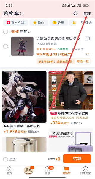 2、在進入到購物車頁面后,可以點擊管理按鈕,進行管理商品。