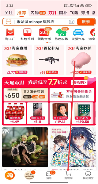 1、打開淘寶后,點擊底部購物車按鈕,跳轉(zhuǎn)至購物車頁面查看。