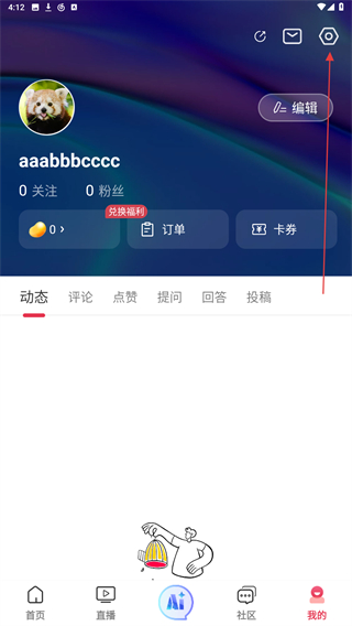 2、在我的頁(yè)面內(nèi),點(diǎn)擊右上角設(shè)置的功能按鈕。