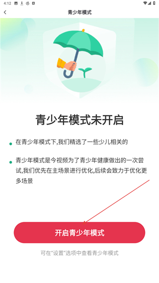 4、進(jìn)入該頁(yè)面內(nèi),仔細(xì)閱讀后點(diǎn)擊開(kāi)啟青少年模式。