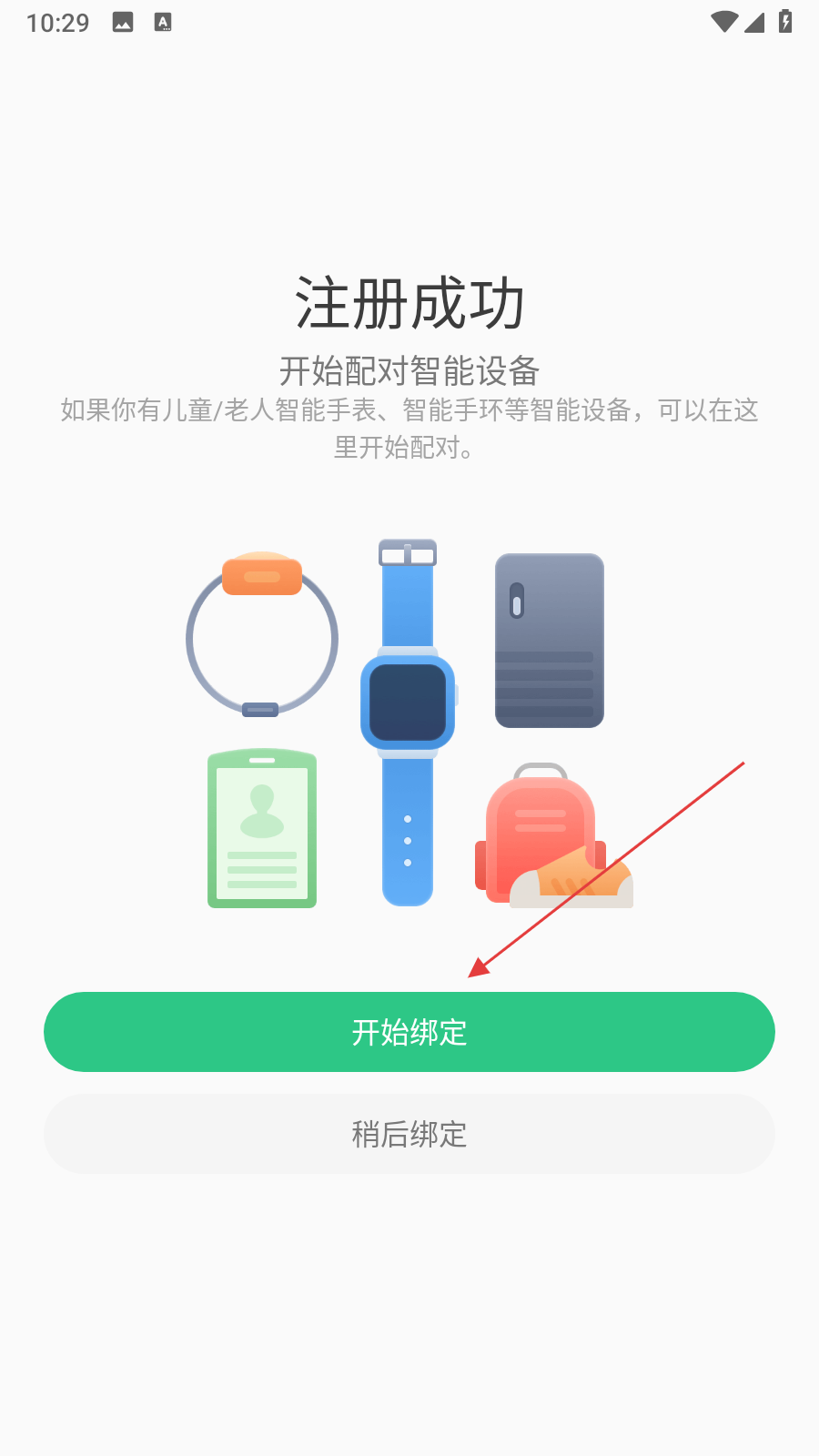 1、注冊(cè)并登錄智天使APP,注冊(cè)成功后在提示頁面點(diǎn)擊開始綁定按鈕,進(jìn)入設(shè)備綁定流程。