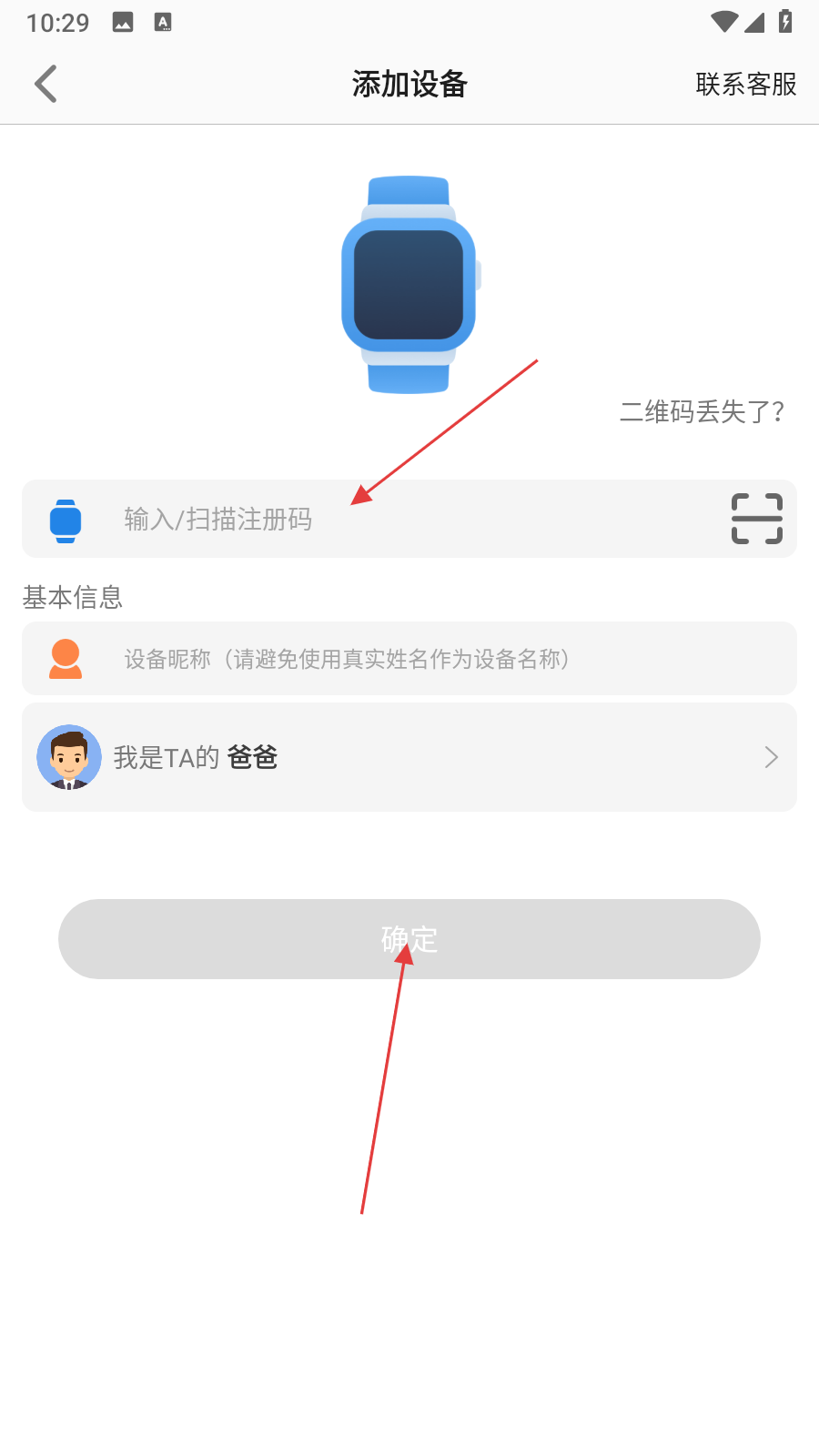 3、在添加設(shè)備頁面,通過輸入或掃描設(shè)備注冊(cè)碼,設(shè)置設(shè)備昵稱并選擇與使用者的關(guān)系,確認(rèn)信息無誤后點(diǎn)擊確定,完成設(shè)備綁定。