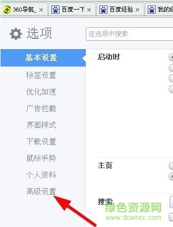 2.單擊進(jìn)入設(shè)置界面后我們可以看到有很多功能,如:基本設(shè)置、標(biāo)簽設(shè)置、優(yōu)化加速、廣告攔截等,在最下邊的那個(gè)功能是【高級設(shè)置】我們需要點(diǎn)進(jìn)去。