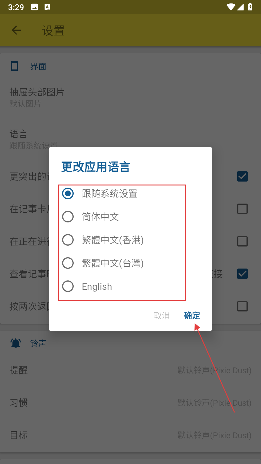 4、彈出更改應(yīng)用語(yǔ)言對(duì)話框后,選擇需要的語(yǔ)言,然后點(diǎn)擊確定按鈕。