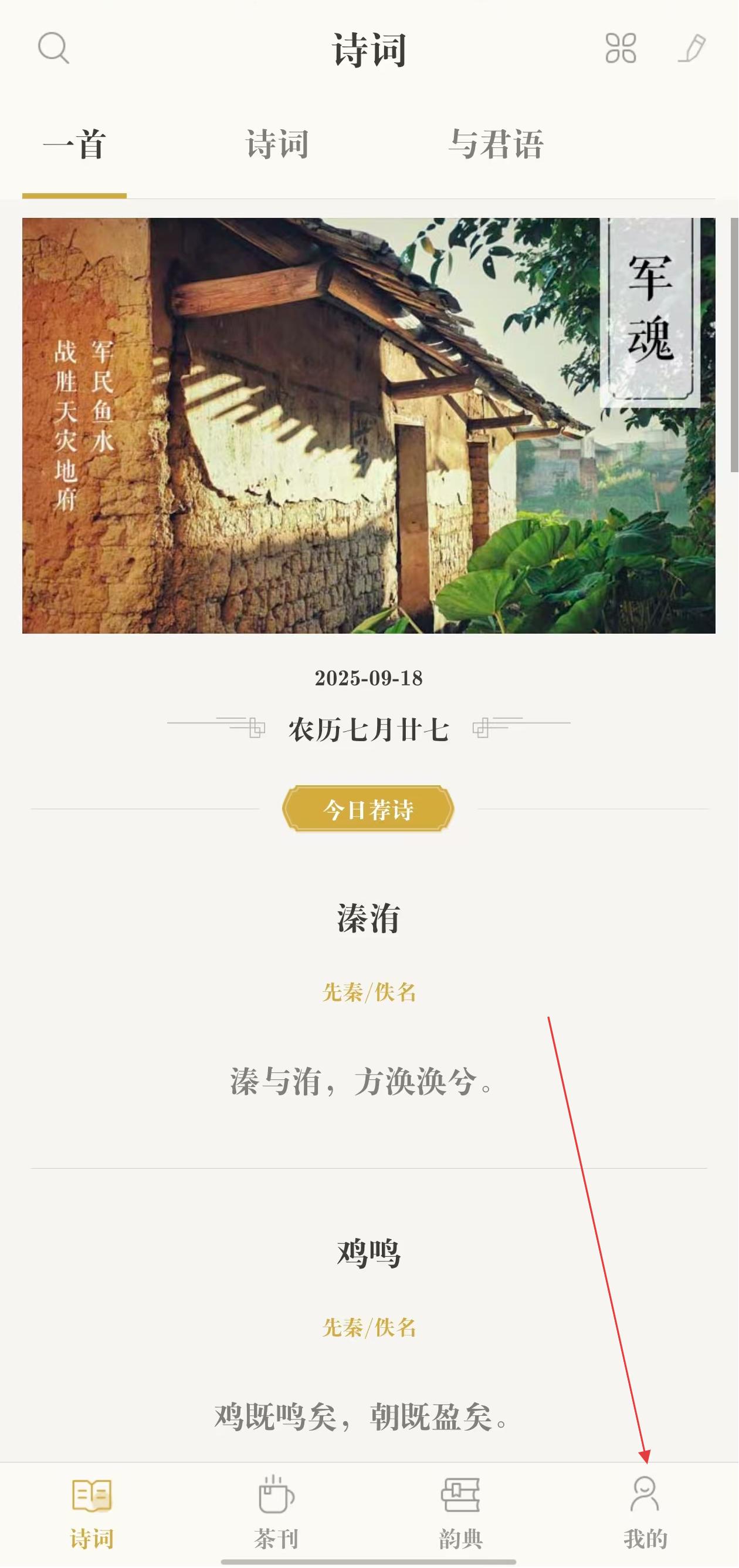 1、打開古詩詞典APP,點(diǎn)擊底部導(dǎo)航欄我的,進(jìn)入個(gè)人頁面。