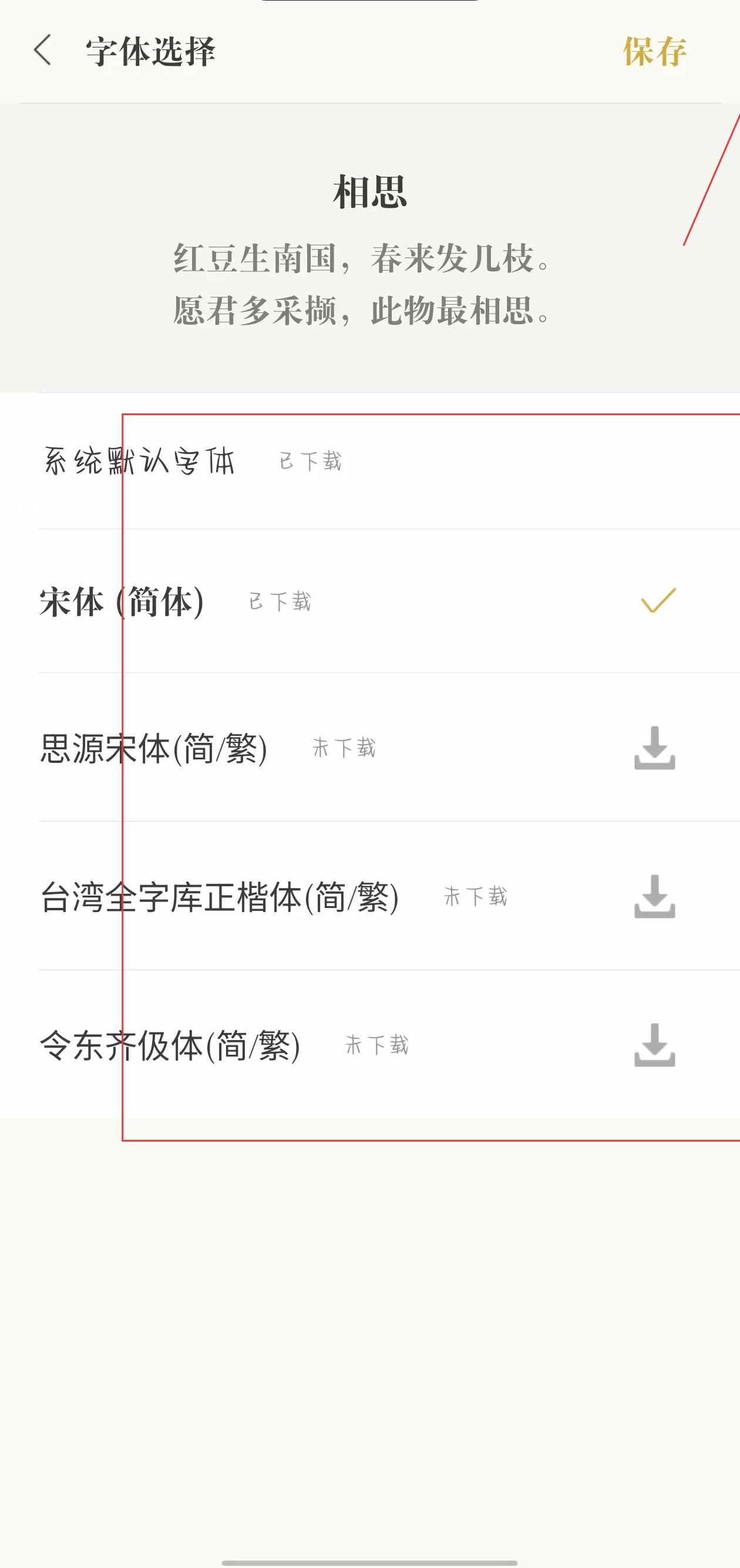 4、在字體選擇頁面,選擇喜歡的字體,點(diǎn)擊右側(cè)下載圖標(biāo)完成下載后,再選中該字體,最后點(diǎn)擊右上角保存。